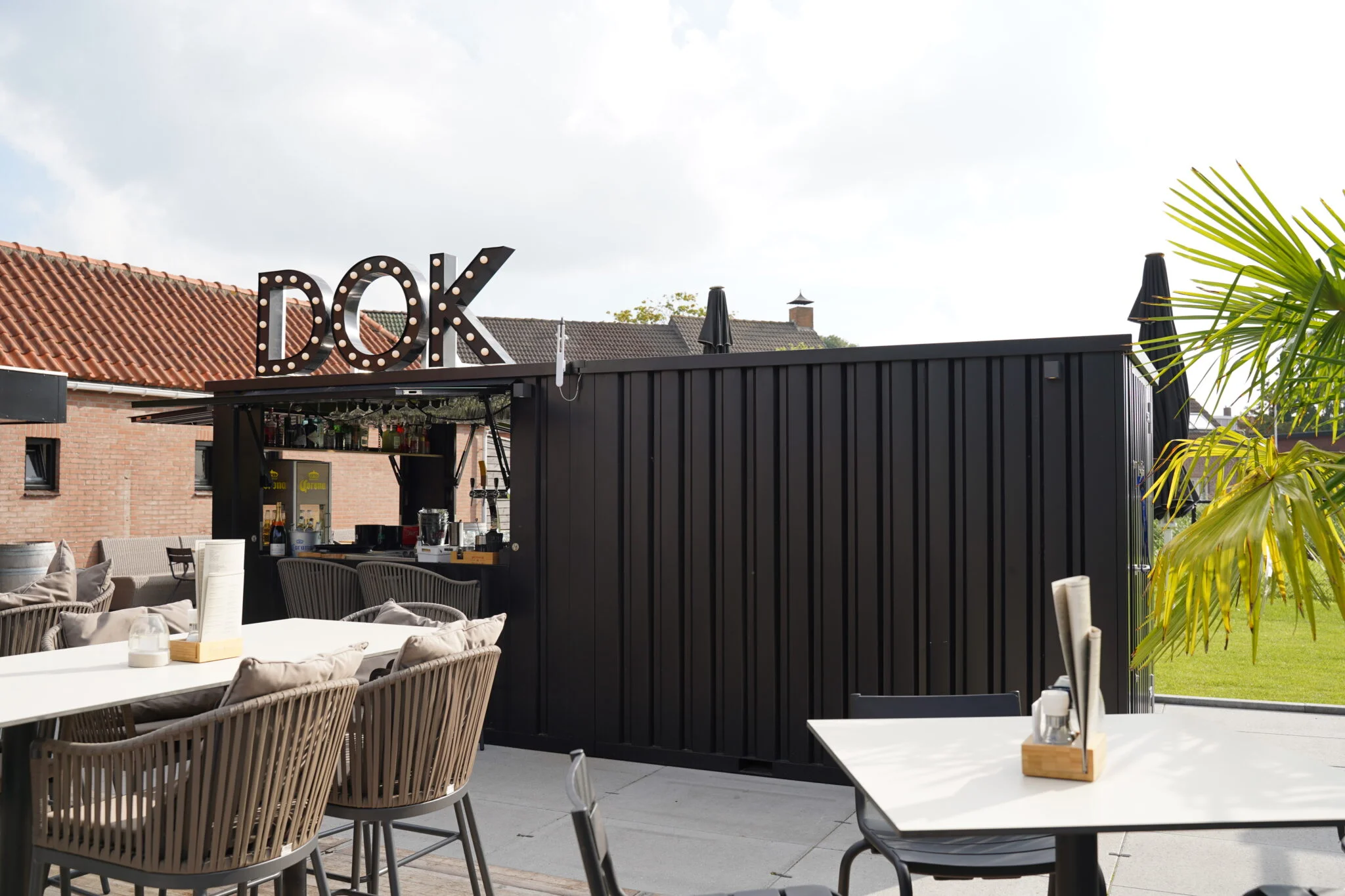 La grande barra esterna è di circa 8 × 2 metri, è di colore nero e ha una tenda pieghevole, le sue dimensioni sono all’incirca le stesse di quelle di un contenitore rimovibile di 26 piedi. È l’ideale per le persone che aspettano di mettersi asciutte e dà al grande bar all’aperto l’aspetto di un vero bar. La tenda può anche essere ripiegata e bloccata di nuovo, il che consente di lasciarsi in sicurezza la grande barra esterna con gli articoli interni. C’è anche una doppia porta sul lato piccolo. Rende possibile entrare in oggetti voluminosi come botti di birra. È quindi il modo ideale per offrire un drink a visitatori o amici. Un grande bar all’aperto semplice ma solido.